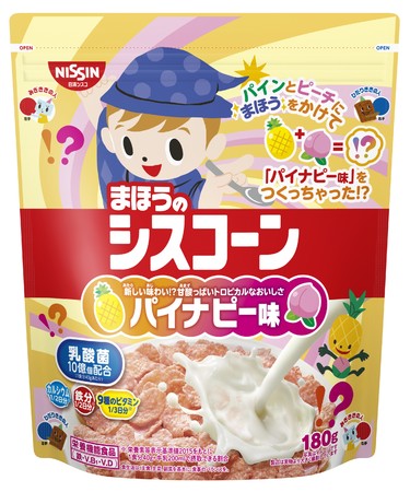 パッケージには、スプーンを片手に魔法使いになりきった「シスコーン坊や」が、パインとピーチに魔法をかけて新しい味わいを生み出す様子をデザインし、“ワクワク感”や楽しい雰囲気を表現しました。また、1食分 (40g) に牛乳200mlをかけて食べると、1日に必要な量に対して、カルシウムと鉄分は1/2、9種類(*2)のビタミンはそれぞれ1/3以上を摂取することができます。