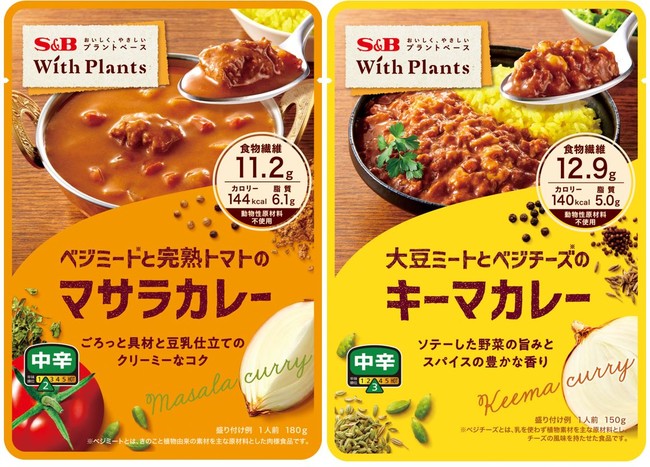 エスビー食品株式会社は、プラントベースフードへの「素材のおいしさ」と「栄養素」に対するニーズに応えたレトルトカレー「With Plants ベジミートと完熟トマトのマサラカレー 中辛」「With Plants 大豆ミートとベジチーズのキーマカレー 中辛」を新発売します。