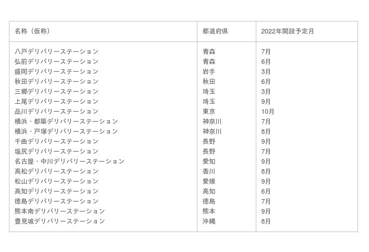 2022年に開設する18拠点の名称(仮称)と開設予定月は以下の通りです。