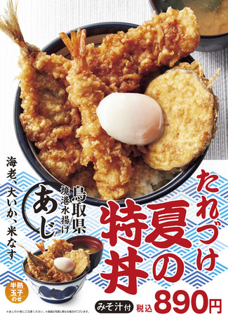 昨年好評だった「たれづけ夏の特丼」が再登場。天ぷらをまるごと甘辛たれにくぐらせた「海老」・「大いか」・「米なす」・肉厚ふっくら鳥取県境港水揚げ「あじ」は、半熟玉子とも相性抜群です。