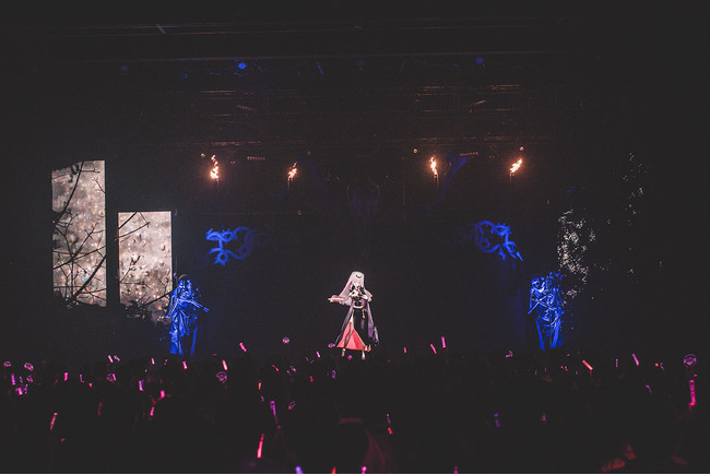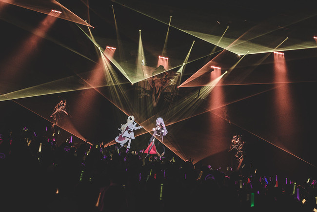 息を切らしつつホロライブ所属の先輩たちと駆け抜けたゲスト・パートが終わると、再びMori Calliopeのソロ・ステージへ。「いじめっ子Bully」では妖艶な雰囲気も漂わせ、Mori Calliopeというアーティストの奥深さを感じさせられた。メロディアスなビートの「UnAlive」ではステージ上に大きな炎が巻き起こり、さらにDead Beatsたちを冥界へとグイグイ誘っていく。アグレッシブなヴォーカルを轟かせ、ステージを左右に動き回る彼女の姿は、これがメジャー・デビュー・コンサートだとは思えないほど頼もしいものだった。