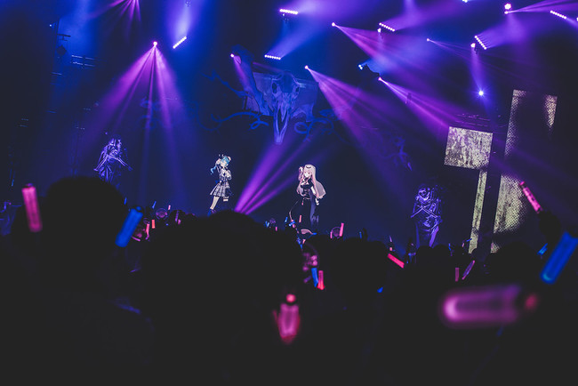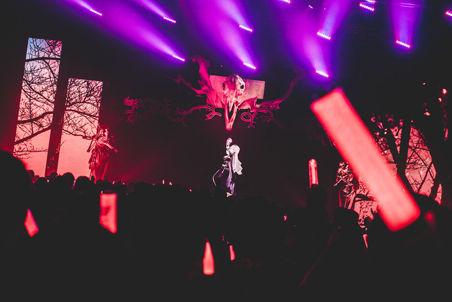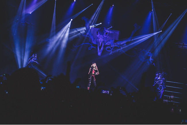 舞台の両側、そして上部に死神をかたどったモチーフが配置され、否が応でも“冥界”を意識してしまうインパクトあるダークなステージ。会場アナウンスのあと、「New Underworld Order」のはじまりを告げるオープニング映像と共にオーディエンスは総立ちとなり、ペンライトの煌めきが一斉に会場を覆った。