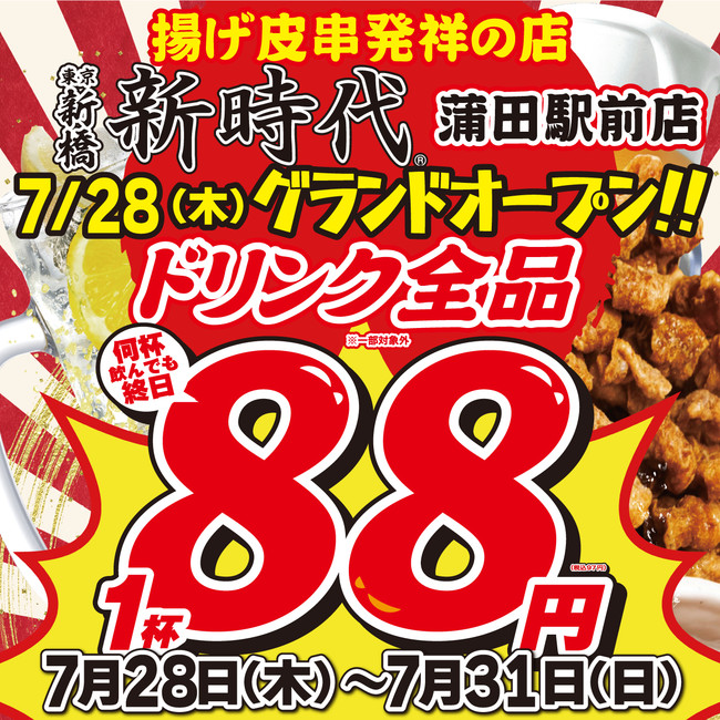 「新時代 蒲田駅前店」のオープンを記念し、ドリンク全品を1杯88円(税込97円)でお楽しみ頂けるキャンペーンを開催します。