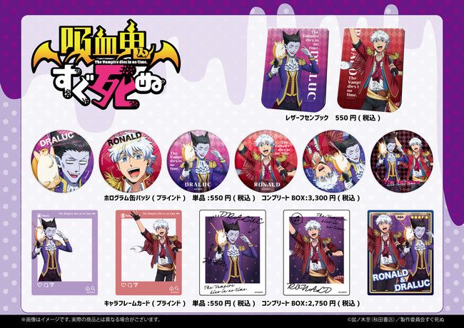 TVアニメ『吸血鬼すぐ死ぬ』の描き下ろしイラストを使用したホログラム缶バッジ、キャラフレームカード、レザーフセンブックが登場!