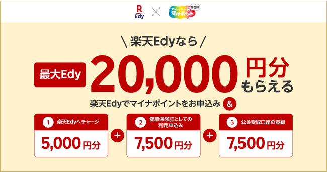 これにより、マイナポイントの申し込みで決済サービスに「楽天Edy」を選択した場合は、健康保険証としての利用申込を行った方、公金受取口座の登録を行った方それぞれに、7,500円相当の「Edy」が付与され、第2弾として合計最大20,000円相当の「Edy」が付与されます。