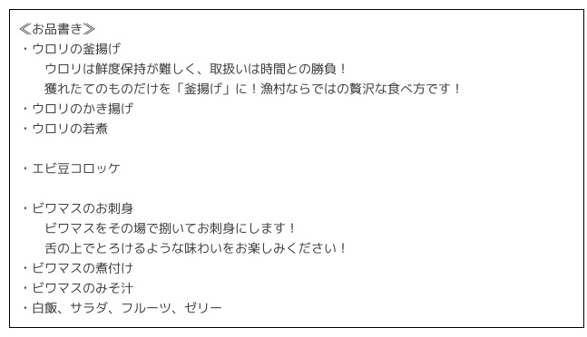 ※当日の天候により、ウロリ漁をご覧いただけない場合があります(不漁)。その場合は、ウロリの釜揚げに代わるお料理をご用意する場合がございます。