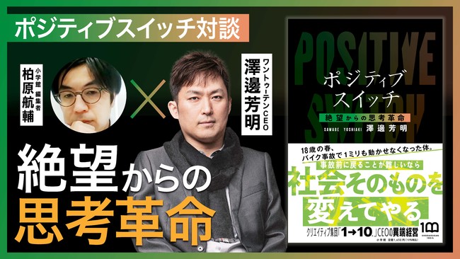 この特別対談は各分野で活躍するトップランナーを招いてワントゥーテンCEOの澤邊芳明が「ポジティブスイッチ」というテーマで対談するシリーズ企画で、小学館編集者の柏原航輔氏を招いた対談動画第2弾も同時に公開いたしました。この対談シリーズ企画は、8月1日に小学館より発売された「ポジティブスイッチ 絶望からの思考革命/澤邊芳明(著)」の刊行を記念して実施されます。