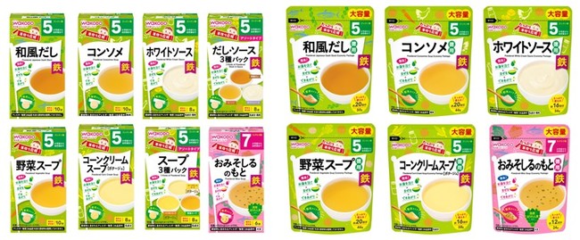 今回のリニューアルでは、離乳食作りに欠かせないだしやスープ、おみそしる等のタイプで、離乳食では不足しがちな成分である鉄を新たに配合しました。それぞれの素材の風味を生かしたやさしい味付けに仕上げています。