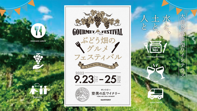 「ぶどう畑のグルメフェスティバル」は、お客様にサントリー登美の丘ワイナリーならではのワインづくりをご理解いただき、大自然の中で丁寧に育まれた日本ワインをおいしい食事とともにお楽しみいただきたいという思いから、期間限定で開催するものです。本イベント限定のランチボックスをはじめとするフードコンテンツや、ワイナリーツアーなどさまざまな企画を用意しています。