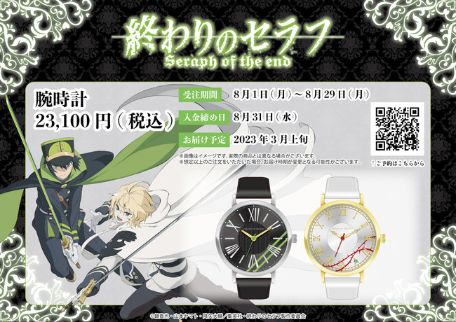 2015年にTVアニメ放送された「終わりのセラフ」から百夜優一郎と、百夜ミカエラをイメージした腕時計が発売されます。