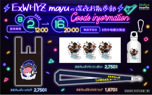 interfm(TOKYO:89.7MHz)は、現在レギュラー放送中の 「ExWHYZ mayuの深夜お散歩部」(毎週月曜・夜10時)の初の番組グッズを、2022年8月2日から受注販売することが決定しましたことを、お知らせ致します。