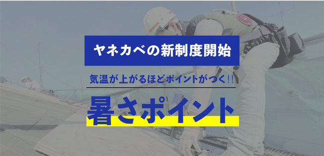 ヤネカベは2010年のサービス開始から今年、累計施工件数が2万5千件を突破しました。多くの方に選んでいただけている理由の1つには高品質施工を提供する正社員の職人「現場革命部」の活躍があります。今年は、例年よりも暑さが厳しいことが予想され、6月の後半には35℃以上の猛暑日が続きました。職人が作業する屋根の上は、日光を遮るものがないため、屋根の表面温度は70℃を超えます。そんな環境下でも丁寧に工事をする現場革命部の頑張りを報いたいと今回のポイント制度を考案しました。