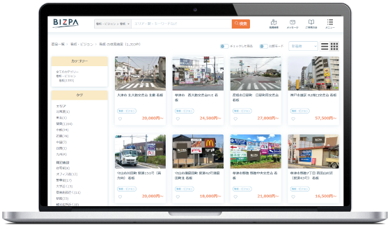 広告プラットフォーム「BIZPA(ビズパ)」を運営する株式会社ビズパ(本社:東京都渋谷区、代表取締役:石井俊之)は、ロードサイドを中心とする看板広告の掲載を本格スタートしました。滋賀県・大阪府・京都府を中心に看板広告を所有する株式会社プロフリー(本社:滋賀県栗東市、代表取締役社長:内記 雅明)を始めとした看板所有会社様ご協力の下、掲載数は1,700商品を突破しております。