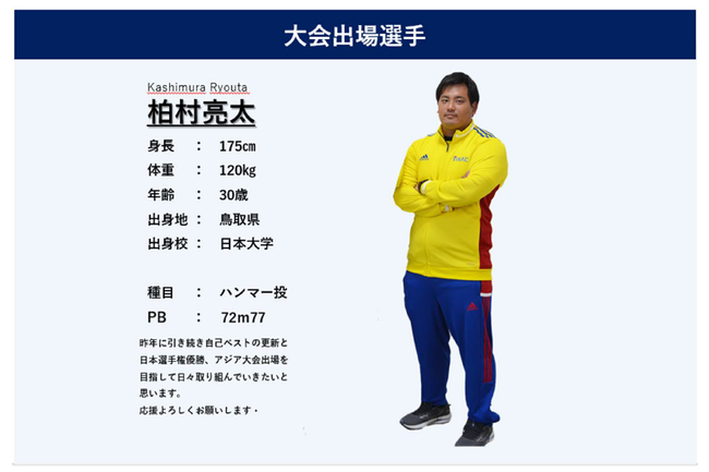 2022年8月6日(土)、神奈川県平塚市で開催予定の「第62回実業団・学生対抗陸上競技大会【2022オールスターナイト陸上】」に、ヤマダホールディングス陸上競技部所属の柏村良太 選手が出場いたします。