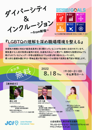 公益社団法人東京青年会議所(所在地:東京都千代田区平河町、理事長:山本 健太)は多様性(ダイバーシティ)を認め、受け入れ、活かす(インクルージョン)をテーマに「ダイバーシティ&インクルージョンfrom新宿」(以下、「本事業」といいます。)を開催します。参加する中堅・中小企業及び小規模事業者の経営者、人事担当者等を募集します。新宿区の中堅・中小企業及び小規模事業者がLGBTQへの正確な理解と対応を進め、新たな人材の確保や職場環境の整備を通じて雇用の安定を高めることは、新宿区が国際競争力の維持・拡大の一つのステップとして、ビジネス・経済・社会・文化の発展に繋がると考えております。本事業では、LGBTQに対する理解を深め、またその経済成長率の関係と諸外国の取り組みなどの学び、そして実際のLGBTQの方々に対するNGワードやNGリアクションを学習できる機会を基調講演として行います。またLGBTQの当事者の方々をお呼びして、社会の中で困っていることや悩んでいることなど、普段聞くことができない生の声を伺い、また最後にLGBTQに対する企業活動に活かせるようなパネルディスカッションも実施します。