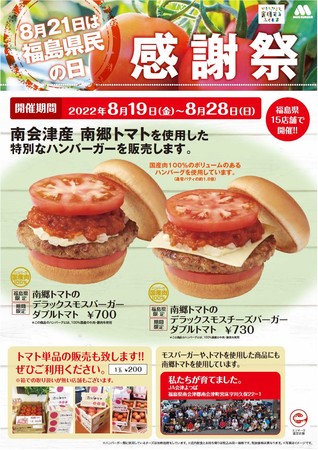 モスバーガーを展開する株式会社モスフードサービス(代表取締役社長:中村 栄輔、本社:東京都品川区)は、8月21日の「福島県民の日」にあわせて、2022年8月19日(金)~8月28日(日)の10日間と9月30日(金)~10月2日(日)の3日間、福島県のモスバーガー全15店舗で、トマトを使った全ての商品に、産地から直送した南会津特産の“南郷トマト”を使用する『モスの産直野菜フェスタ』を実施します。また、地域・期間限定の商品も販売します。