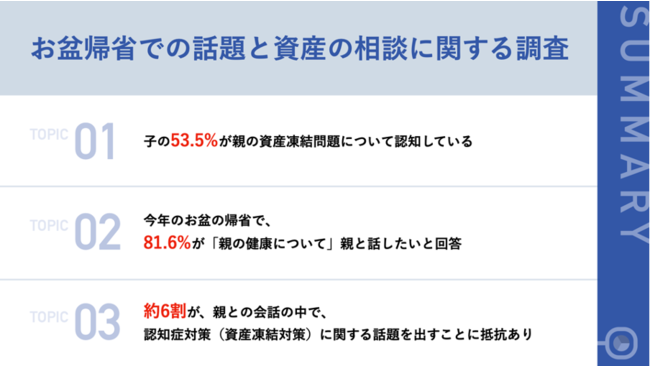 これらの背景もあり、今年のお盆の帰省時には、81.6%が「親の健康について」親と話したいと考えているようです。一方で、約6割が親との会話の中で、認知症対策(資産凍結対策)に関する話題を出すことは「センシティブな内容」であるために心理的な抵抗を感じる実態も伺えました。