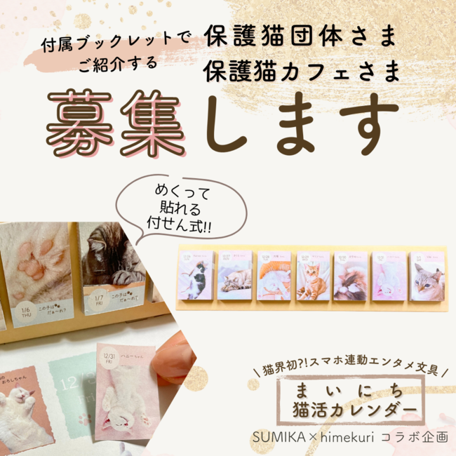 株式会社TIRAMISU(本社:東京都世田谷区 代表取締役:高澤 匡 以下「当社」)が運営する猫ぐらしブランド「キミとワタシのSUMIKA」(以下「SUMIKA」)は、日めくりカレンダーの開発・販売を手がける株式会社ケープランニング(東京都文京区 代表取締役 木下 良)が運営する文具ブランド「himekuri」とのコラボレーションにて制作中の2023年度版 付せん式日めくりカレンダー『まいにち猫活カレンダー』付属ブックレット内でご紹介する保護猫団体さま・保護猫カフェさまを募集しています。