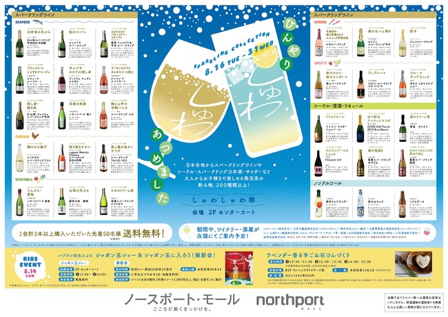 「ノースポート・モール」(横浜市都筑区)では、夏にぴったりの冷やして美味しい発泡系の飲み物を集めた「しゅわしゅわ祭」(以下、本イベント)を、2022年8月16日(火)から8月31日(水)まで、2階センターコートにて開催します。