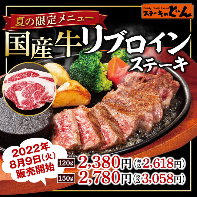 【ステーキのどん】夏の限定メニューとして「国産牛リブロインステーキ」を販売。濃厚な牛肉の風味ととろけるサシのうまみでワンランク上のステーキ体験を。8月9日(火)より販売開始。