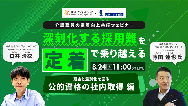 ツナググループHC×株式会社ガネット共催 介護職員の定着向上ウェビナー『深刻化する採用難を"定着"で乗り越える~競合と差別化を図る公的資格の社内取得 編~』