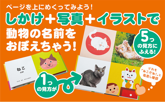 本書では、招き猫のイラスト、公園で遊んでいる猫、丸まって寝ている猫のイラストなど、同じ仲間のどうぶつをイラストと写真の5つのシーンで紹介。どうぶつの名前を覚えるだけでなく、考える力や観察する力も育てます。