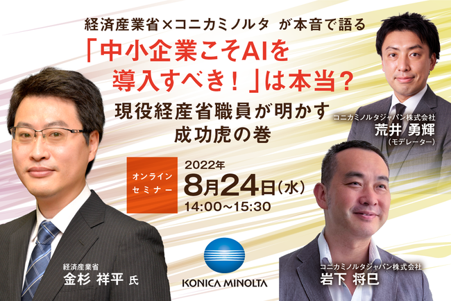 コニカミノルタジャパン株式会社は、「経済産業省×コニカミノルタが本音で語る『中小企業こそAIを導入すべき!』は本当?現役経産省職員が明かす成功虎の巻」オンラインセミナーを2022年8月24日(水)14時より開催することをお知らせします。