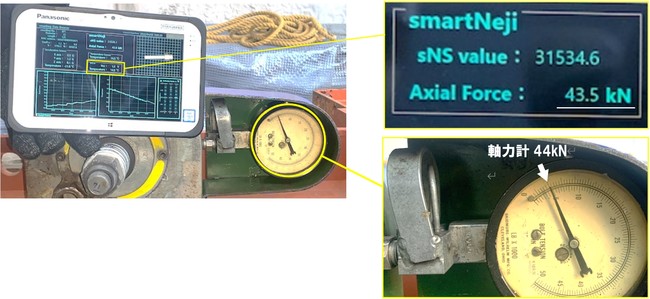 smartNejiで検出した軸力データが軸力計の値に一致していることを確認し,smartNejiの精確性を検証したうえでモニタリングを開始しています。