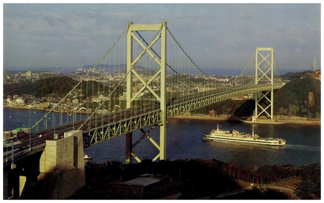 吊橋(道路橋)。1973年(昭和48年)に開通。IHIも北九州側の主塔の製作・架設工事に携わった。