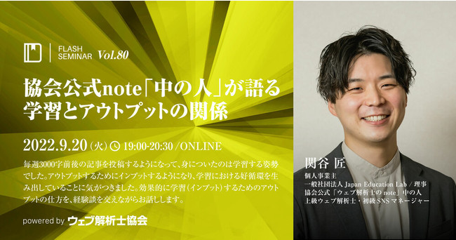 2022/09/20(火)19:00 - 20:30【Flashセミナー】 Vol.80 【無料】協会公式note「中の人」が語る学習とアウトプットの関係