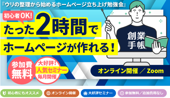 会社の母子手帳『創業手帳』を発行する創業手帳株式会社(本社:東京都中央区京橋、代表:大久保幸世)では、現在、起業家向けセミナー「たった2時間でホームページが作れる!ウリの整理から始めるホームページ立ち上げ勉強会」を定期開催しています。
