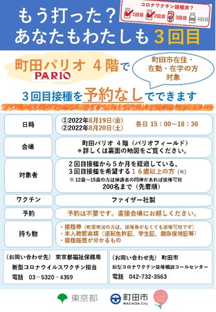 ▼町田パリオで新型コロナワクチンの予約なし接種を実施します