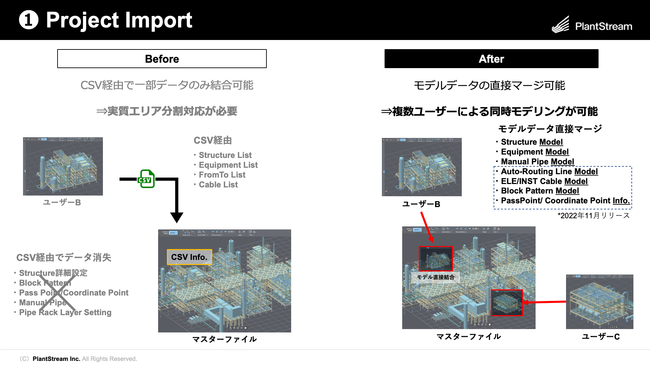 大規模なプラントやエリア毎に複数人で作業するモデルデータを扱うことが可能となります。大規模プラント設計を行う上で、共同作業はなくてはならない機能であり、今回のアップデートで待望の実装となりました。