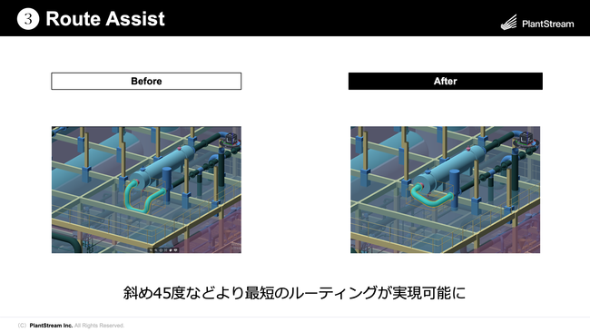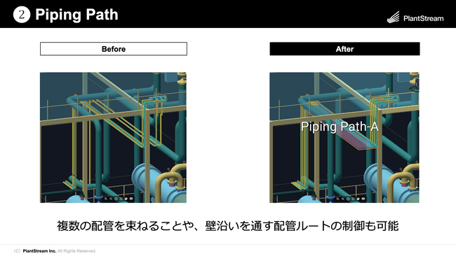 これまでは配管経路を制御するために、パスポイントを使用し、配管一本毎に細かな調整を必要としておりました。このPiping Path機能により、複数の配管を束ねたり、例えば、壁沿いを通す配管ルートの制御も可能となりました。今後のアップデートにおいても、更なるルート品質改善に努めてまいります。