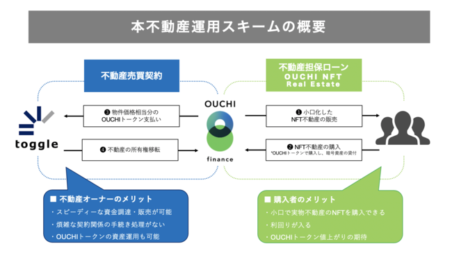 本実証実験では、最初に当社代表がドバイにて保有するマンションの一室を担保とした不動産担保ローンNFTを、OUCHI financeが市場の投資家に販売することでOUCHIトークン(OUCHI financeのガバナンストークン)を調達します。次に、目標数量の調達が完了後、OUCHI financeはその調達した暗号資産を元手に対象不動産を購入し、所有権が移転される計画となっております。