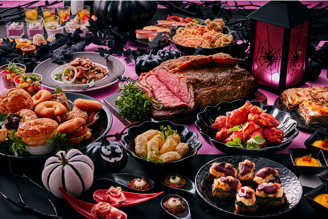 ドーナツチキンバーガー、ビーフシチューパイ包み焼き、ローストビーフ、ヤンニョムチキン、ナスのラザニア、ハロウィーンピザ、カラスカレイのフリッター、ブラックラーメン、目玉チーズ、かぼちゃの生ハム巻き ハロウィーン仕立て、鶏炭火焼きマリネ セサミオイルの香り、魔女のカレー、にぎり寿司5種、秋野菜の天ぷら、目玉のタルト、モンスタードーナツ、おばけのケーキ、マスカットのパンナコッタなど。