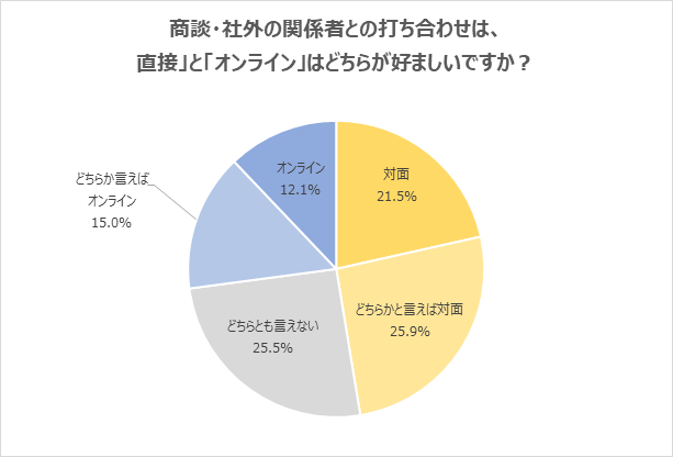 商談・社外の関係者との打ち合わせは、「対面(オフライン)」が好ましいと回答した20代が、約半数にあたる47.4%に上りました。「対面のほうが雑談をしやすく、相手のことを良く知れると思う」「対面のほうが印象に残り、覚えてもらいやすい」「営業する場合は対面のほうが誠意を伝えることができるし、逆に営業を受ける場合も、対面のほうが信頼してお任せできるかを判断できる」などの声が寄せられました。一方、「最初は対面で、関係性が築けたらオンラインでも対応可能だと思う」「サービスの紹介はオンラインで、提案は対面でなど、ケースに応じて適した方法を選びたい」などの声も上がっており、目的によって使い分けたいという意向もうかがえます。