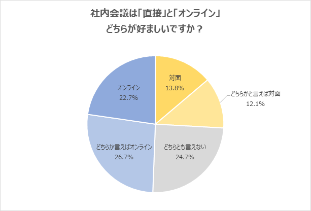 社内会議は「オンライン」が好ましいと回答した20代が49.4%に上りました。「対面(オフライン)」は25.9%に留まり。社内会議は「オンライン」のほうが好まれていることが分かります。「特に多くの人が集まる会議は、オンラインのほうが日程調整をしやすい」「オンラインのほうが脱線せず、生産性の高い仕事ができると思う」「ブレストは対面のほうが良いものの、連絡や共有がメインの打ち合わせはオンラインで対応可能だと思う」などの声が寄せられました。