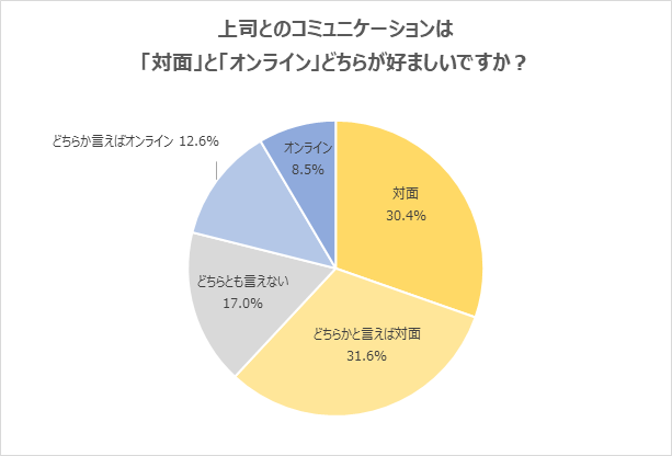 上司とのコミュニケーションは「対面(オフライン)」が好ましいと回答した20代が62.0%に上りました。「直接のほうが微妙なニュアンスなどは分かりやすい」「報告や連絡は、チャットやオンラインでも対応できるものの、相談は対面のほうが良いと思う」「直接フィードバックをもらえると励みになる」などの声が上がりました。中には、「上司がオンラインツールを使いこなせていないので、対面のほうがスムーズにコミュニケーションを取れる」「上司がオンラインよりも対面を好んでいる」といった指摘もありました。