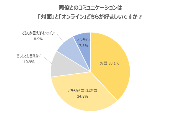 同僚とのコミュニケーションは「対面」が好ましいの回答が7割を超える。「反応が分かる」「アイディアが浮かびやすい」「相手の忙しさや状況に応じて、気遣うことができる」の声/20代アンケート