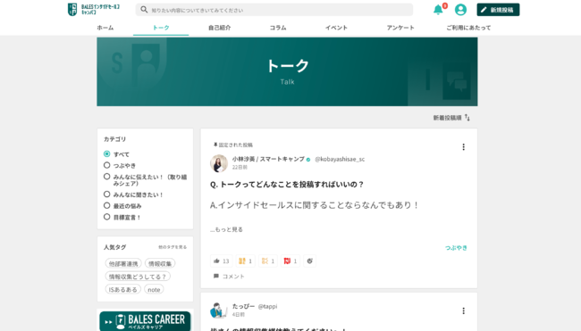 BALES インサイドセールス キャンパスは、すでにインサイドセールスを導入している企業やそこに携わる方をはじめ、インサイドセールスに興味のある法人・個人が、情報収集や発信など通じて、インサイドセールスについて最新情報を知ることができるオンラインコミュニティです。