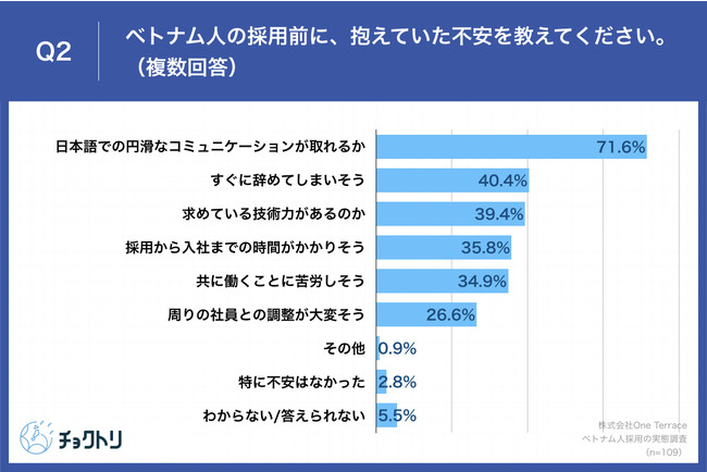 「Q2.ベトナム人の採用前に、抱えていた不安を教えてください。(複数回答)」(n=109)と質問したところ、「日本語での円滑なコミュニケーションが取れるか」が71.6%、「すぐに辞めてしまいそう」が40.4%、「求めている技術力があるのか」が39.4%という回答となりました。