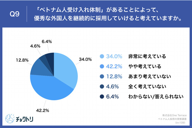「Q9.「ベトナム人受け入れ体制」があることによって、優秀な外国人を継続的に採用していけると考えていますか。」(n=109)と質問したところ、「非常に考えている」が34.0%、「やや考えている」が42.2%という回答となりました。