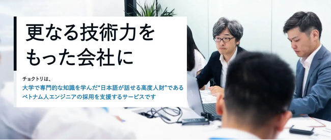 チョクトリとは、”日本語が話せる”×”専門的なスキルを取得”したベトナムや韓国、ミャンマーの技術エンジニアを海外から直接紹介するサービスです。