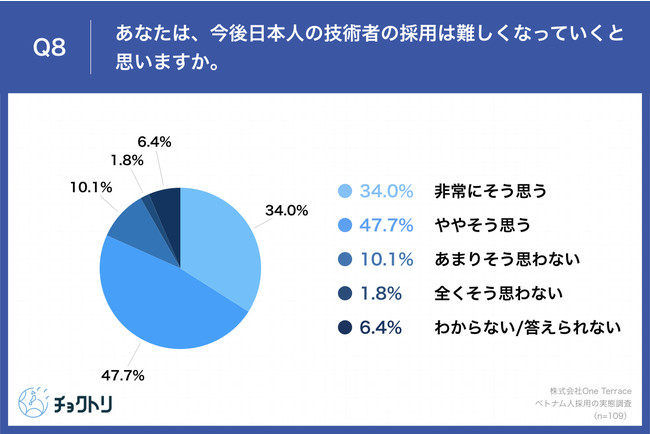 「Q8.あなたは、今後日本人の技術者の採用は難しくなっていくと思いますか。」(n=109)と質問したところ、「非常にそう思う」が34.0%、「ややそう思う」が47.7%という回答となりました。