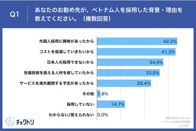 「Q1.あなたのお勤め先が、ベトナム人を採用した背景・理由を教えてください。(複数回答)」(n=109)と質問したところ、「外国人採用に興味があったから」が42.2%、「コストを低減していきたいから」が41.3%、「日本人の採用できないから」が34.9%という回答となりました。