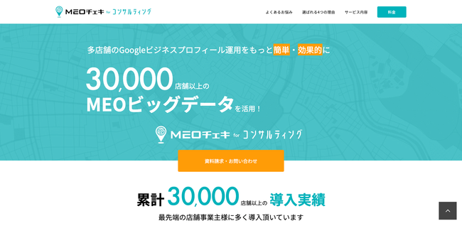 国内30,000店舗以上に導入されるMEOツール「MEOチェキ」のビッグデータを活用した複数店舗向けのMEOコンサルティングサービスです。