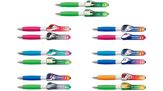 クリップ部分に新幹線車両のイラストがあしらわれたボールペン2本セットです。イラスト部分は凹凸をつけて浮き出た作りになっており、立体感があります。
