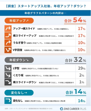 スタートアップへの転職を考えるとき、気になることの一つが「年収」です。2022年4月、転職サイト「ONE CARRER PLUS」が発表した調査(https://plus.onecareer.jp/articles/13)によると、スタートアップに転職をした会員のうち54%が「年収アップ」、32%が「年収ダウン」、14%が「変化なし」という回答でした。