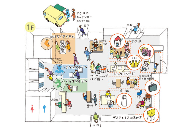 メイン会場の1階では、かき氷の販売や、くふうの詰まったコクヨ文具の販売、GLOOのワークショップや、ノウハウのある社員からの持ち物指南、デスクとイスの選び方コーナーなどを展開します。
